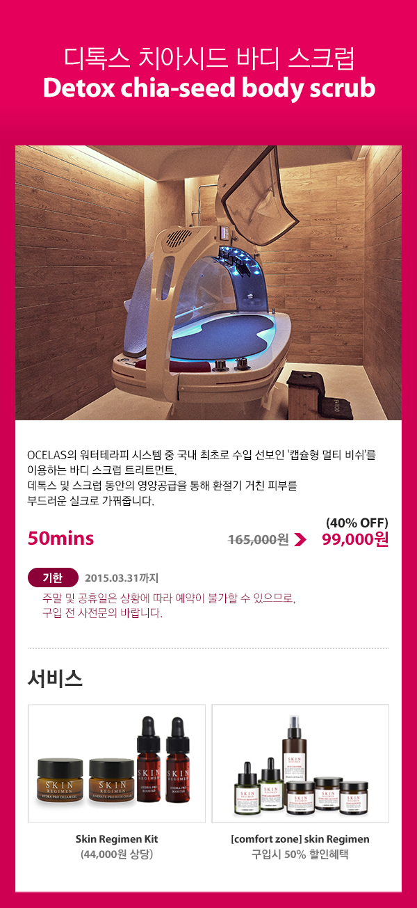Detox chia-seed body scrub OCELAS의 워터테라피 시스템 중 국내 최초로 수입 선보인 데톡스 및 스크럽 동안의 영양공급을 통해