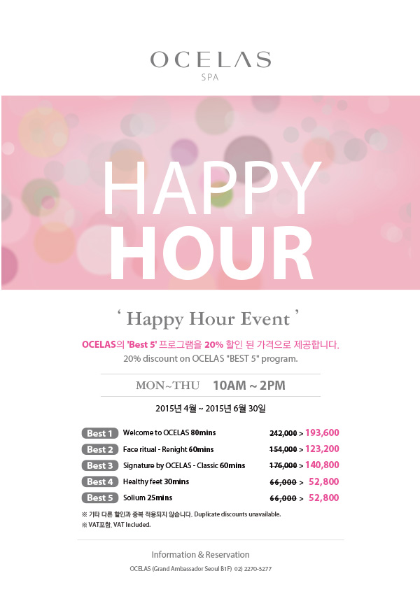 MON~THU 10AM ~ 2PM 20% discount on OCELAS "BEST 5" program. 2015년 4월 ~ 2015년 6월 30일 ※ 기타 다른 할인과 중복 적용되지 않습니다. Duplicate discounts unavailable.