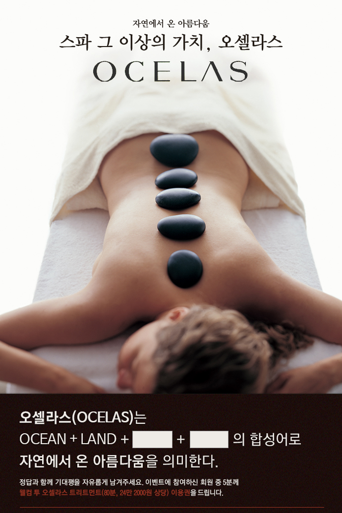스파체험권을 드려요~ 노블래스 닷컴 해당 싸이트에 들어 가서 이벤트 참여 하시면 오셀라스가 선사하는 “웰컴 투 오셀라스” 체험권을 드립니다~^^