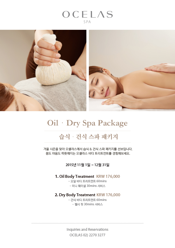 ![]() OilㆍDry Spa Package 습식ㆍ건식 스파 패키지 겨울 시즌을 맞아 오셀라스에서 습식 & 건식 스파 패키지를 선보입니다.