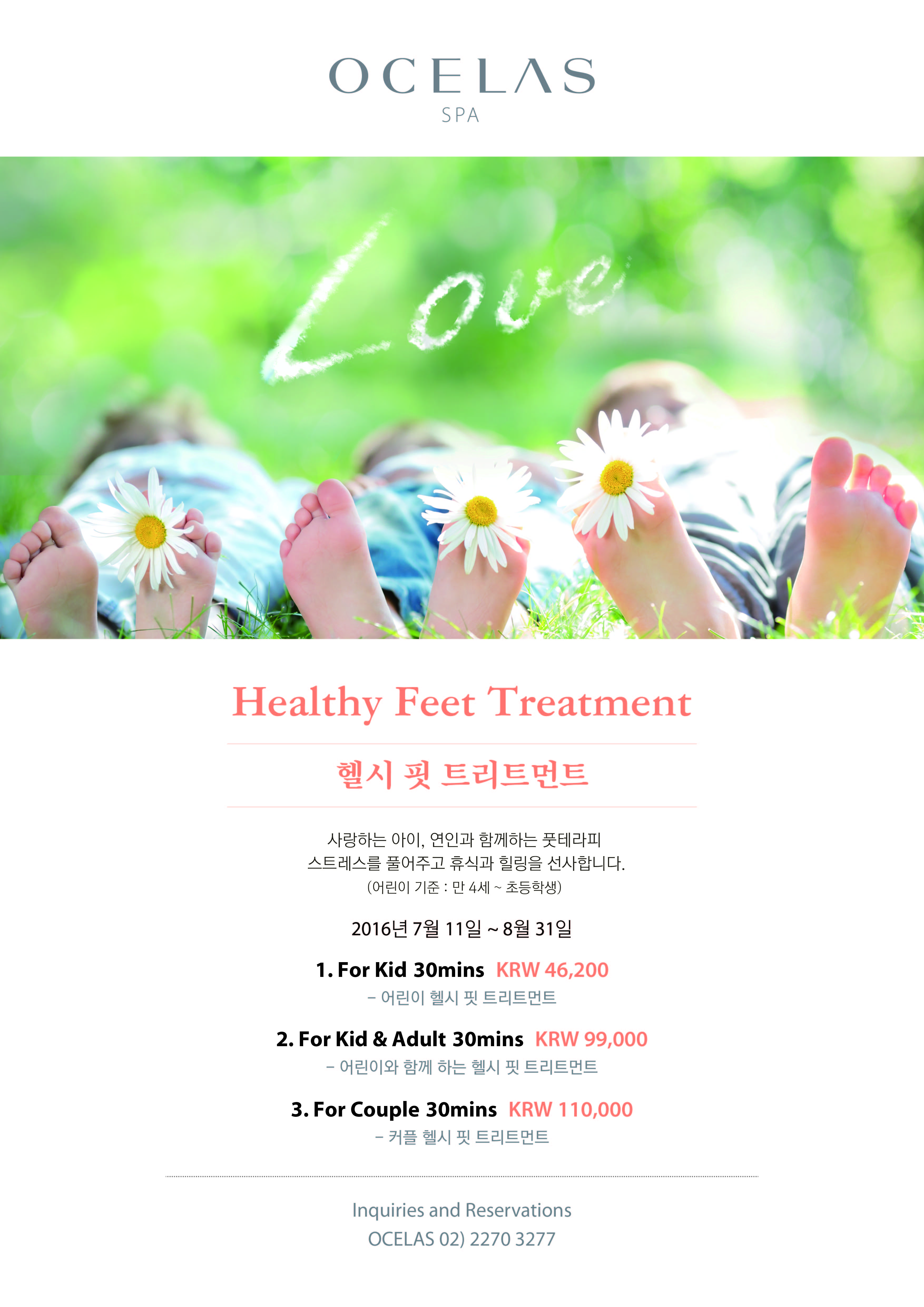 Healthy Feet Treatment 사랑하는 아이, 연인과 함께 하는 풋 테라피 스트레스를 풀어주고 휴식과 힐링을 선사합니다. (어린이 기준 : 만 4세 ~ 초등학생) 2016년 7월 11일 - 8월 31일 1. For Kid 30mins KRW 46,200 -어린이 헬시 핏 트리트먼트 2. For Kid & Adult 30mins KRW 99,000 - 어린이와 함께 하는 헬시 핏 트리트먼트 3. For Couple 30mins KRW 110,000 - 커플 헬시 핏 트리트먼트 ![]() |