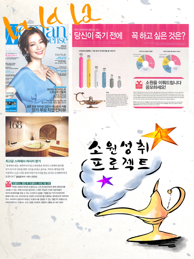 우먼센스 300회 기념 특별기획 <소원성취 프로젝트>에 오셀라스가 동참합니다. 최고급 스파에서 마사지 받기 머리부터 발끝까지 80분간 오셀라스를 경험할 수 있는 많은 응모 부탁드립니다.